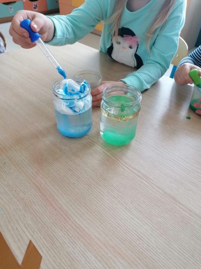 Vaikai tyrinėjo ar kiaušinis virtas, ar žalias jį sukdami (virtas kiaušinis sukasi smagiau), skandindami labai sūriame vandenyje (virtas kiaušinis plūduriuoja). Sužinojo, kad stiklainyje su skutimosi putomis vanduo nusidažo greičiau, nei stiklainyje su aliejumi, nes jos praleidžia dažus.