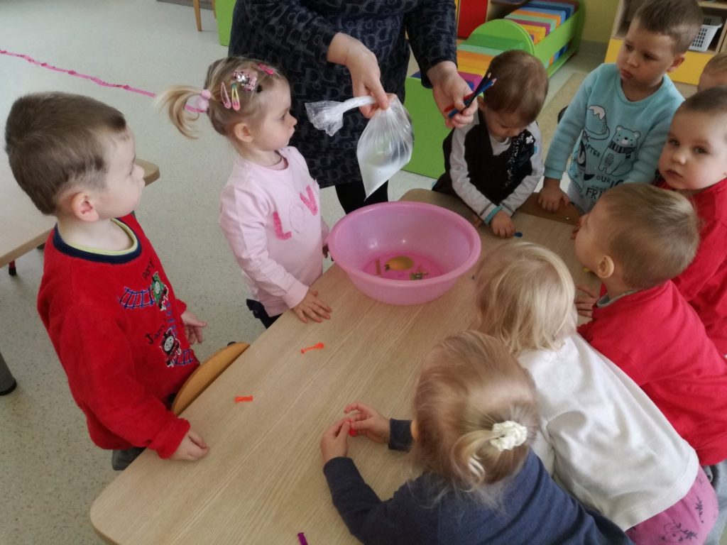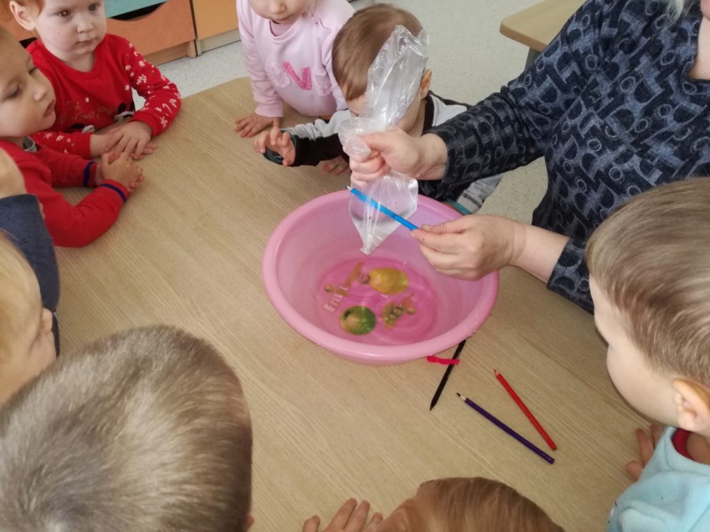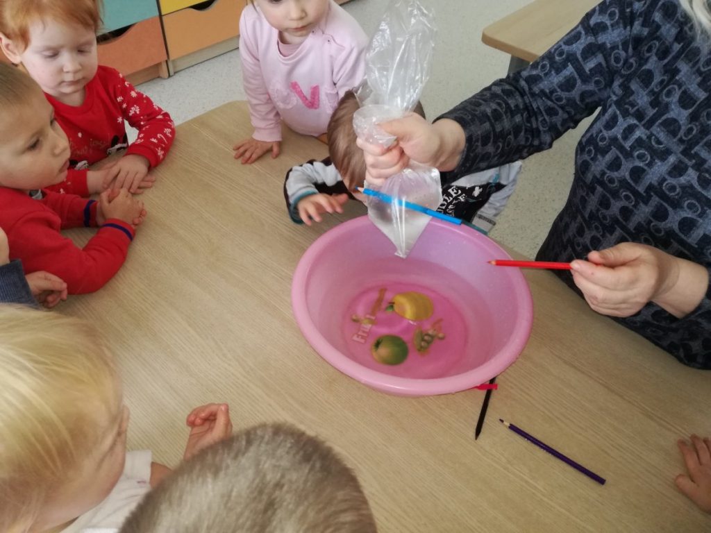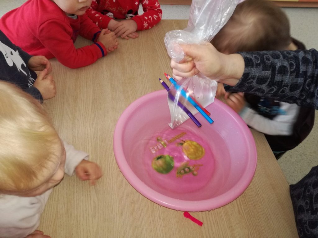 Grupės „Boružėlės“ vaikai, kartu su auklėtoja Janina, tyrinėjo spalvotų pieštukų galimybes. Atliko eksperimentą: pripylė maišelį vandens ir užrišo. Pieštukais vėrė per maišelį su vandeniu.