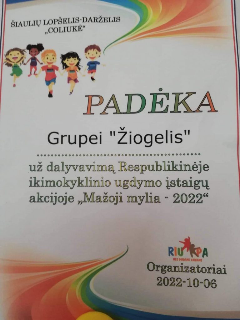 5–6 metų jungtinės priešmokyklinio ugdymo grupės „Žiogelis“ ugdytiniai š. m. spalio 6 d. išsiruošė į svečius – lopšelio-darželio „Coliukė“ bendruomenė pakvietė dalyvauti respublikinėje ikimokyklinių ugdymo įstaigų akcijoje „Mažoji mylia – 2022“. Vaikai įveikė 250 metrų bėgimo distanciją, bendravo su bendraamžiais. Emocijos puikios!