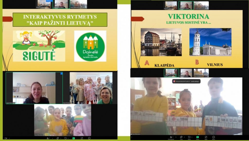 Kovo 11-osios proga priešmokyklinio ugdymo grupių vaikai jungėsi į respublikinį priešmokyklinio ugdymo grupių interaktyvų rytmetį „Kaip pažinti Lietuvą“, kurį penktus metus organizuoja priešmokyklinio ugdymo mokytojos Asta Želionienė ir Ligita Petkuvienė, Šiaulių lopšelis-darželis „Sigutė”. Šio renginio tikslas – skatinti priešmokyklinio ugdymo mokytojų tarpusavio bendradarbiavimą, kuriant užduotis ir organizuojant interaktyvų rytmetį. Įstaigos atsitiktine tvarka buvo suskirstytos į poras ir jungėsi į virtualius susitikimus. Rytmetyje dalyvavo 18 priešmokyklinio ugdymo grupių iš Kauno, Kėdainių, Šiaulių miesto ir Šiaulių rajono švietimo įstaigų. Mokytojos iš anksto paruošė vaizdines ir interaktyvias užduotis, aptarė tarpusavyje, kokios žinios ir faktai apie Lietuvą yra svarbūs, įdomūs priešmokyklinukams ir atrado daugybę būdų ir metodų, kaip vaikams pažinti Lietuvą, panaudojant interaktyvias, kūrybines užduotis, folkloro elementus, STEAM, IT, skaitmeninius žaidimus. Džiugu, kad visos įstaigos labai originaliai ir kūrybiškai organizavo savo rytmečius: vieni žaidė interaktyvias „Kahoot!“ viktorinas, skaitmeninius žaidimus, „keliavo“ po Lietuvos lankytinas vietas, naudodamiesi interaktyviu Lietuvos žemėlapiu, kiti atkodavo svarbius miestų objektus, kūrė Lietuvos žemėlapį su lankytinais didžiausių šalies miestų objektais, statė pilis iš vienkartinių puodelių, kūrė iš Lego kaladėlių Televizijos bokštą ir Gedimino pilį, matavo jų aukštį, ilgį, plotį, kūrė bendrą darbą su popieriniais delnais ir kt.