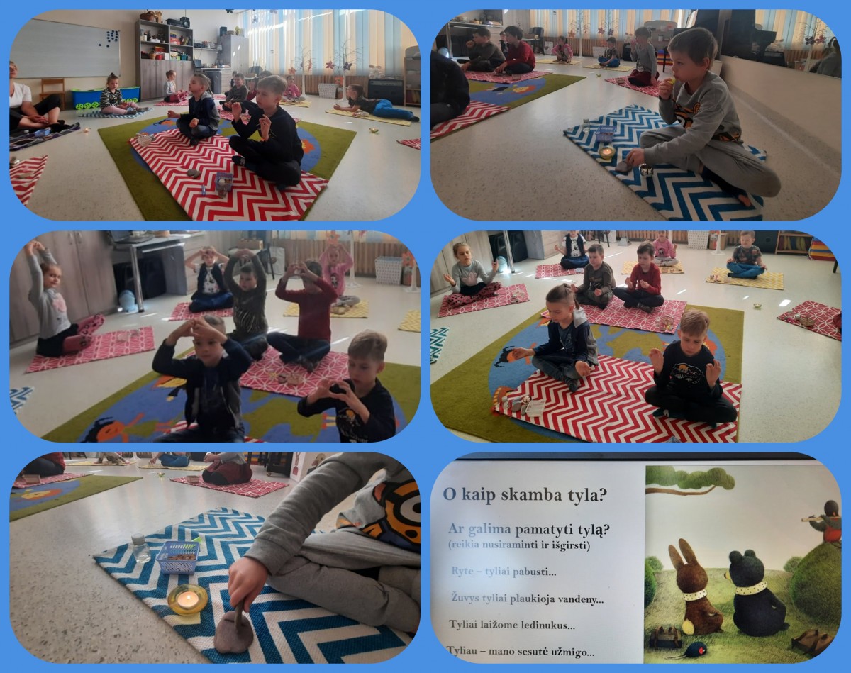 Pamokėlės metu, priešmokyklinio ugdymo grupės „Žiogelis” vaikams buvo pateikti pagrindiniai triukšmo šaltiniai, paaiškinta triukšmo žala žmogui. Vaikai stebėjo filmą apie tylos ir triukšmo žalą ir naudą, muzikos salėje skambant terapinei muzikai pritarė įvairiais gamtiniais muzikos instrumentais.