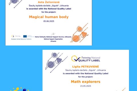 Mūsų įstaigos mokytojos Asta Želionienė ir Ligita Petkuvienė buvo įvertintos Nacionaliniais kokybės ženkleliais (NKŽ) už sėkmingą dalyvavimą tarptautiniuose „eTwinning“ projektuose. Mokytoja Asta kartu su partneriais įgyvendino projektą „Magical human’s body“, kuriame vaikai tyrinėjo žmogaus kūno paslaptis pasitelkdami kūrybines ir patyrimines veiklas, įvairius IKT įrankius, bendrus produktus bei vaizdo konferencijas. Mokytoja Ligita koordinavo projektą „Math explorers“, […]