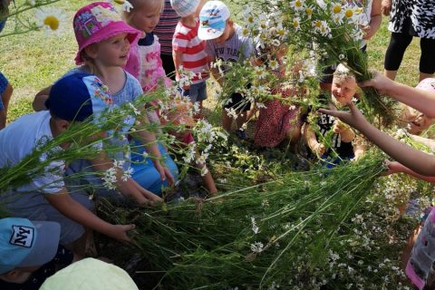 Artėjant Joninių šventei vaikai kūrė iš gamtinės medžiagos: piešė ant akmenėlių, pagaliukų, iš žolynų komponavo paveikslėlius.