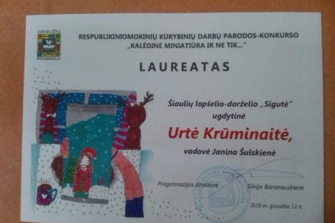 Šiaulių lopšelio-darželio „Sigutė” priešmokyklinio ugdymo grupės „Žiogelis” ugdytinės Ugnė Vaitiekaitytė ir Urtė Krūminaitė tapo respublikinės mokinių miniatiūrų parodos-konkurso „Kalėdinė miniatiūra ir ne tik…” laureatėmis.
