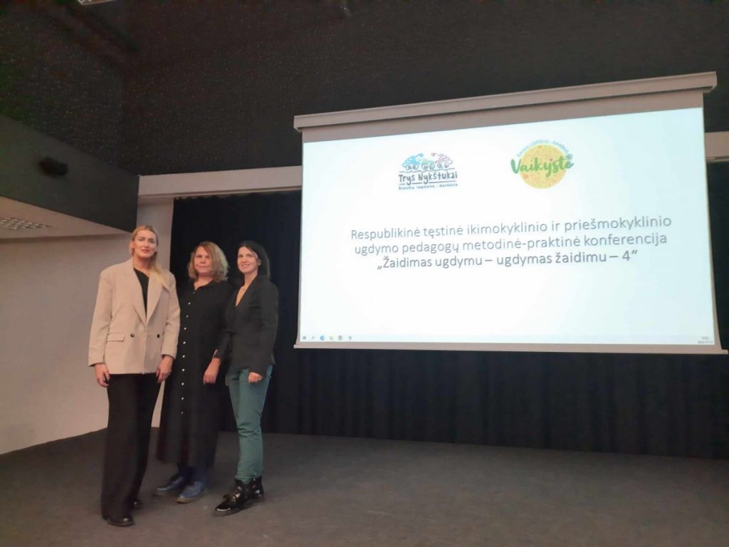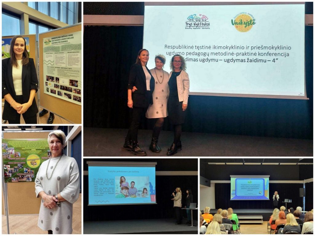 Lapkričio 17 d. didelis būrys mūsų įstaigos mokytojų dalyvavo respublikinėje tęstinėje ikimokyklinio ir priešmokyklinio ugdymo pedagogų metodinėje-praktinėje konferencijoje „Žaidimas ugdymu, ugdymas žaidimu – 4“, kurią organizavo Šiaulių lopšeliai darželiai „Trys Nykštukai“, „Vaikystė“ ir Šiaulių miesto savivaldybės Švietimo centras. Konferencijos tikslas – dalintis gerąja patirtimi apie žaidimo svarbą ikimokyklinio ir priešmokyklinio amžiaus vaikų ugdymui(si). Konferencijoje dalyvavusios mokytojos pasidalino savo patirtimi. Mokytojos Reda Ginelevičienė, Giedrė Gedžiuvienė, Sigita Sankauskienė skaitė pranešimą „Mano šeima gali… nustebinti“ ir pasidalino gražiausiomis akimirkomis apie organizuojamą respublikinį projektą, kuriuo siekiama stiprinti šeimos narių ryšį, įtraukiant tėvus į projektinę kūrybinę veiklą, organizuojant turiningą ir išskirtinę dieną vaikų grupėje. Priešmokyklinio ugdymo mokytoja Asta Želionienė skaitė pranešimą „Skaitmeninės kompetencijos sandų raiška priešmokyklinio amžiaus vaikų žaidybinėse veiklose“ ir pasidalino asmenine patirtimi, kaip sėkmingai plėtoti skaitmeninę kompetenciją priešmokyklinėje pakopoje, tikslingai integruojant skaitmenines technologijas į ugdymo (si) turinį. Mokytoja Aurelija Gudaitienė pristatė stendinį pranešimą „Žaidžiu ir stiprinu save“, kuriame pristatė veiklas, kurios skatina natūralų vaiko poreikį judėti, įgyjant patirtį per žaidimą, skatinant fizinį vaikų aktyvumą, saviraišką judesiu, padedant pažinti savo kūno galimybes, ugdant psichines vaiko galias. Mokytoja Aurelija Bersėnaitė pristatė stendinį pranešimą „Ikimokyklinio amžiaus vaikų skaitmeninės kompetencijos ugdymas per žaidimą“, kur pasidalino sėkmingiausiais veiklos pavyzdžiais: „Stebuklingas kubas“, „Kalbantis portretas“, „Atgiję dinozaurai“, Užkoduotų piešinėlių paroda „Mano boružėlė“ ir kt., naudojant skaitmenines technologijas: planšetinius kompiuterius, bitutes-robotus „Bee-Bot“. Mokytojos džiaugėsi, kad turėjo galimybę pasisemti naujų idėjų ir pasidalinti savo gerąja patirtimi.