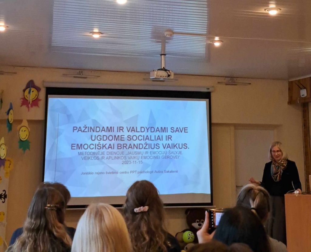 Lapkričio 15 dieną priešmokyklinio ugdymo mokytojos Asta Želionienė, Ligita Petkuvienė, meninio ugdymo mokytoja Roberta Sakalauskienė ir socialinė pedagogė Jovita Mančienė dalyvavo metodinėje dienoje „Jausmų ir emocijų šalyje. Veiklos ir aplinkos emocinei gerovei“, kurią organizavo Šiaulių rajono Meškuičių lopšelis-darželis. Mūsų įstaigos mokytojos pasidalijo patirtimi, įžvalgomis, bandymais, kokiais būdais, metodais, web.20 įrankiais siekia kurti veiklas ir aplinkas, skatinančias emocinę vaikų gerovę. Mokytojos Jovita ir Roberta pristatė pranešimą „Gera pradžia – pusė darbo“, kuriame pasidalijo patirtimi apie ankstyvojo amžiaus vaikų ir jų tėvelių pirmuosius žingsnius, jų sėkmingą į(si)traukimą į įstaigos bendruomenę. Programa „Pirmieji žingsniai darželyje“, padedant mokytojams, švietimo pagalbos specialistams, meninio ugdymo mokytojui jau ne vienerius metus padeda sėkmingai adaptuotis mažiesiems. Mokytoja Ligita pristatė pranešimą „Ar virtualiai praturtintos ugdymosi aplinkos turi įtakos vaikų emocinei gerovei?“. Ji pasidalino savo bandymais, patirtimi, kaip įvairios skaitmeninio turinio kūrimo platformos padeda vaikams labiau pasitikėti savimi, nebijoti klysti, ugdo skaitmeninę kompetenciją. Mokytoja Asta pristatė pranešimą „Kaip motyvuoti priešmokyklinio amžiaus vaikus dalyvauti projektinėse veiklose?“. Jos patirtis dalyvaujant projektuose, ypatingai eTwinning projektuose, didelė, tad kaip tą padaryti ji puikiai žino ir geba. Mokytoja Asta atskleidė, kad svarbiausia pačiai būti motyvuotai, tada ir vaikus bus nesudėtinga sudominti projektinėmis veiklomis.