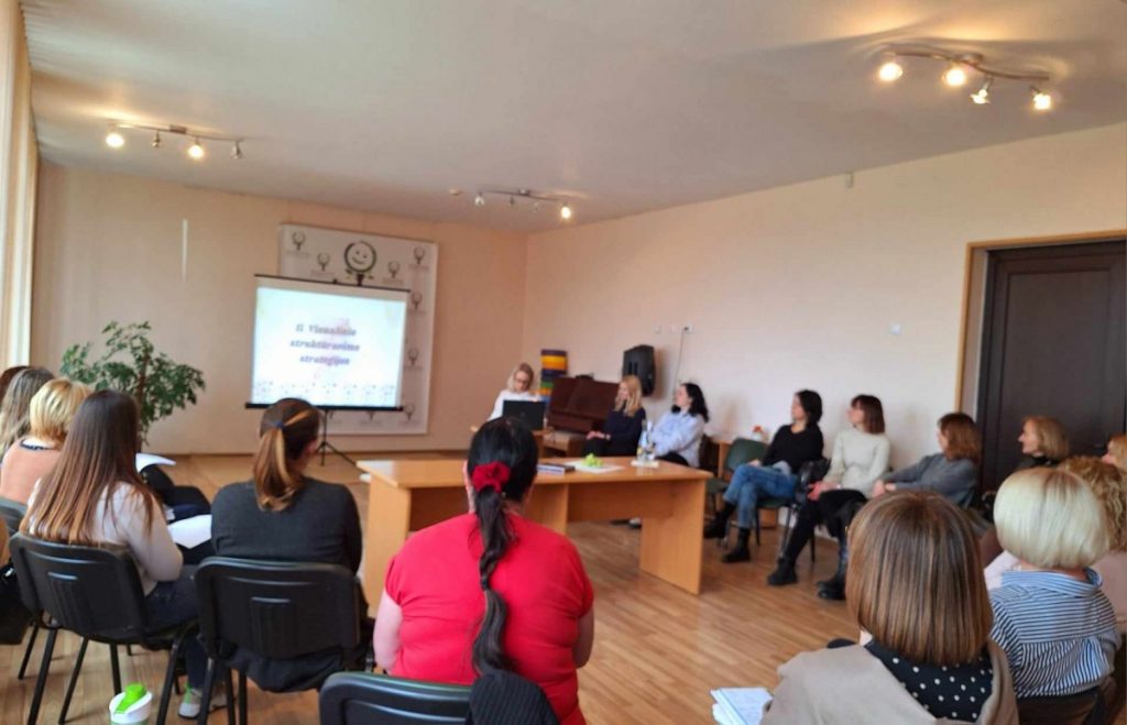 Jų metu Šiaulių lopšelio-darželio „Žilvitis” logopedė G. Musteikienė pristatė mokymų tikslus, kalbėjo apie autizmo sutrikimą turinčių asmenų diagnostinius požymius, svarbiausius ikimokyklinio amžiaus vaikų įtraukiojo ugdymo aspektus, kai vaiko raidos sutrikimai, pasireiškia kokybiniais socialinio bendravimo, komunikacijos ir elgesio sutrikimais. Šiaulių lopšelio-darželio „Sigutė” logopedė J. Tušienė atkreipė dėmesį, kad įtraukusis ugdymas, tai procesas kuriame atsižvelgiama į socialinę, kultūrinę ir mokymosi įvairovę bei remiamasi veiksniais, padedančiais nustatyti bei šalinti kliūtis mokymuisi. Ji pristatė aplinkų, dienotvarkės, veiklų metodus, būdus ir galimybes, papildomo vizualinio struktūravimo strategijas. Šiaulių lopšelio-darželio „Ąžuoliukas” logopedė V. Pleikienė ir Šiaulių „Rasos” progimnazijos ikimokyklinio skyriaus logopedė M. Rovė pristatė paveikslėlius bei simbolius, veiklų struktūravimo sekas ir kvietė dalyvius diskusijai.
