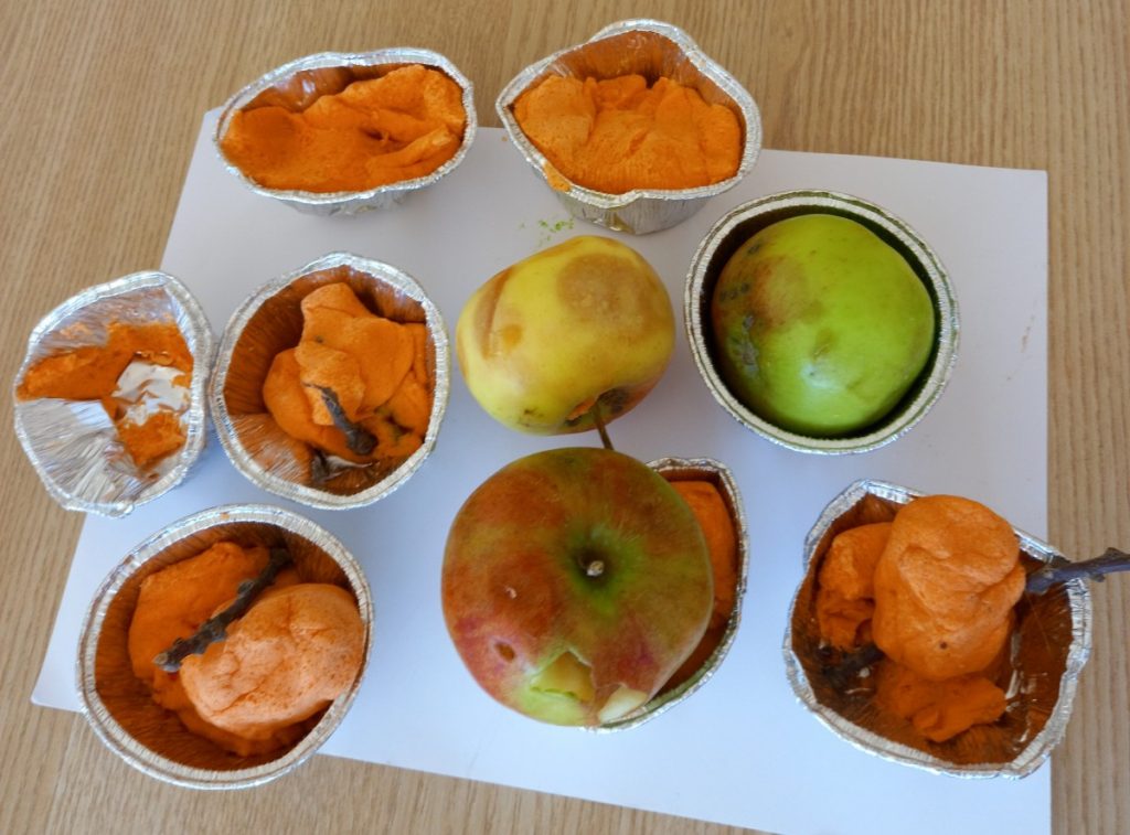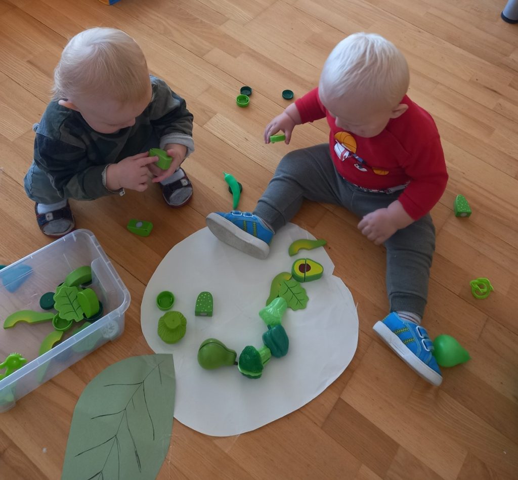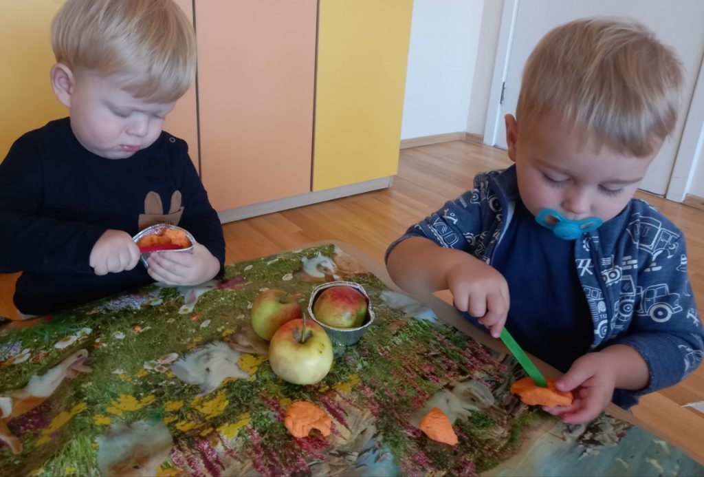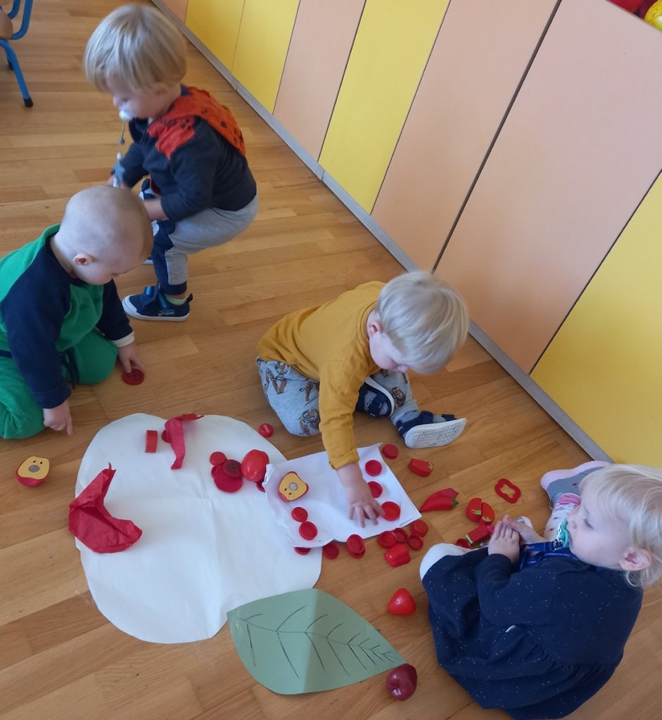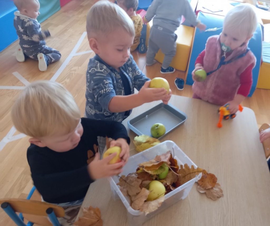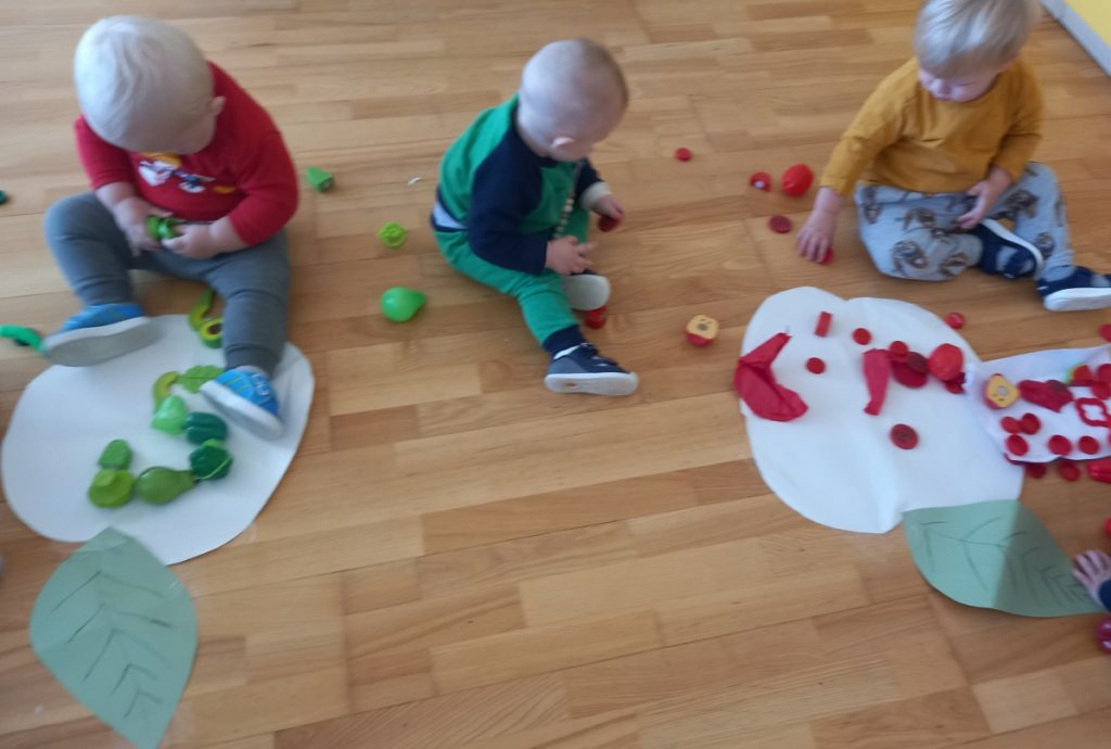 Grupėje „Sraigiukas“ visą savaitę karaliavo obuoliukai. Ugdytiniai dėliojo obuoliukus ant ,,medžio“, ant skirtingo aukščio kaladėlių, ieškojo obuolių paslėptuose lapuose, ,,kepė“ obuolių keksiukus panaudodami sūrią tešlą. Taip pat susipažino su žalia ir raudona spalvomis, dėliodami ant trafareto atitinkamos spalvos žaislus, daiktus.