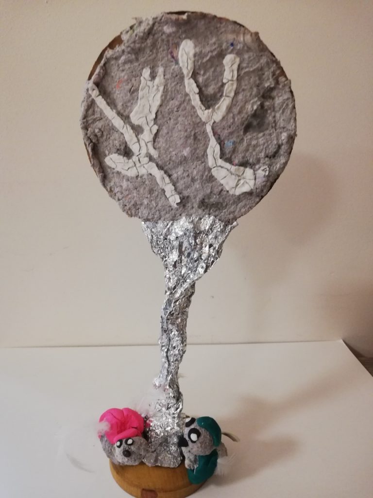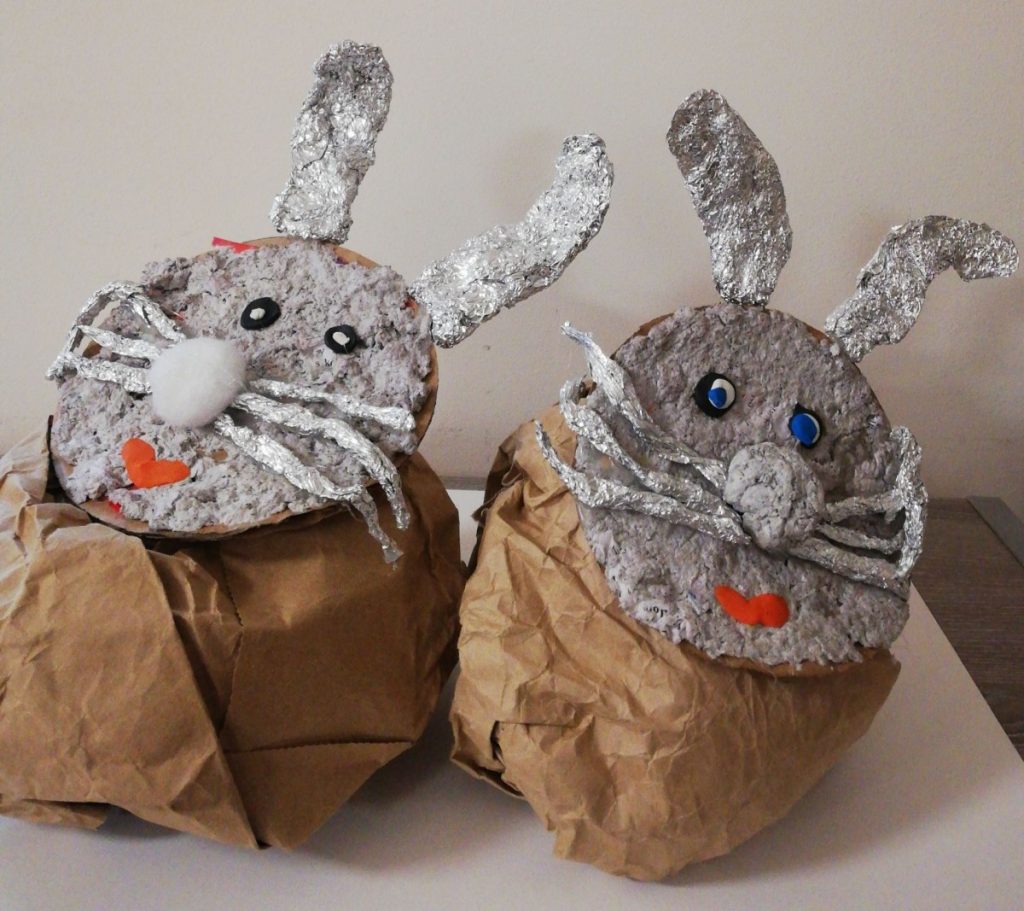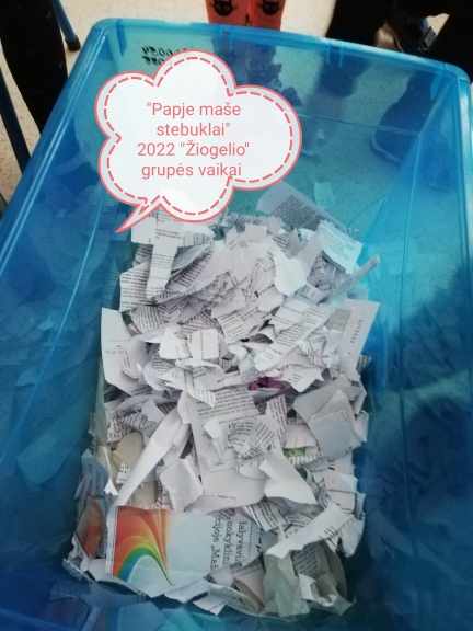 Grupės „Žiogelis“ vaikai susipažino su papjė mašė technika. Smulkino jau nebereikalingus popieriaus lapus, kiaušinių dėklus. Pylė karštą vandenį, klijus. Iš pagamintos masės gamino dekoracijas, žaislus, kūrė pasaką. Veikla sudomino vaikus. Labai svarbu nuo mažens suprasti, kad nebereikalingas popierius gali būti perdirbamas. Tausoji – vadinasi galvoji apie švaresnę Žemę.