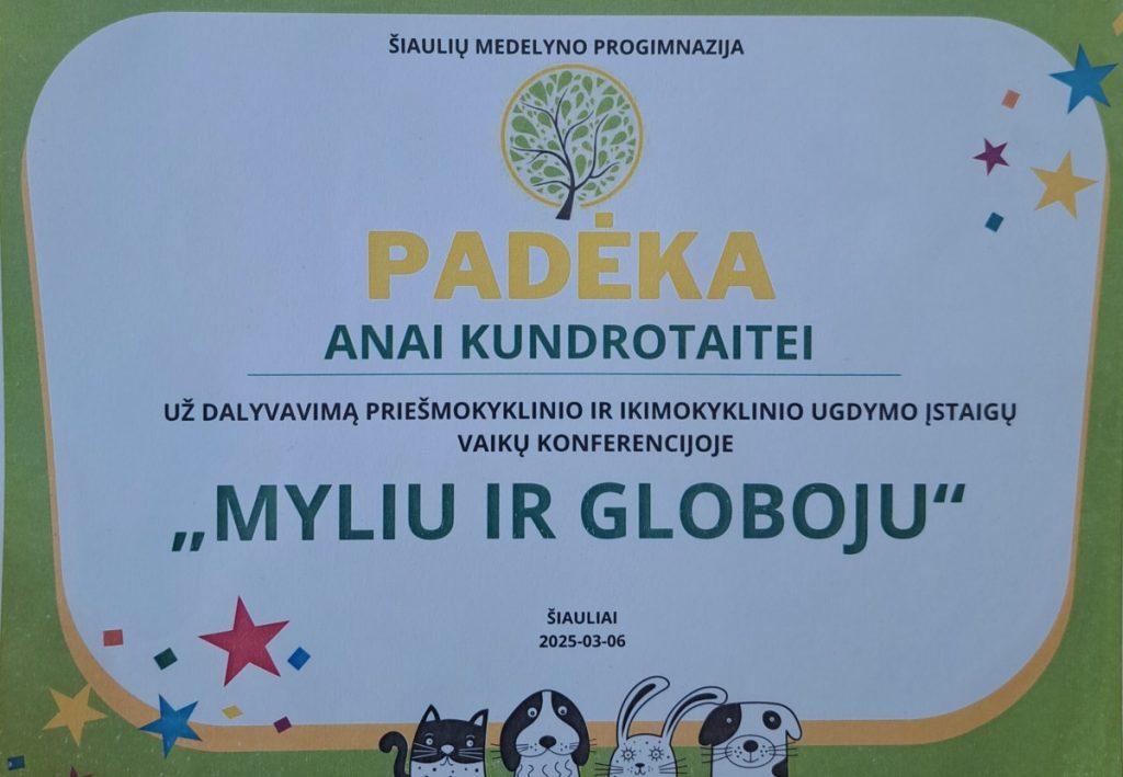 Priešmokyklinės „ Žiogelio“ grupės atstovė Ana Kundrotaitė kovo 6 dieną dalyvavo Šiaulių Medelyno progimnazijos priešmokyklinio ir ikimokyklinio ugdymo įstaigų vaikų konferencijoje „Myliu ir globoju“ ir pristatė pranešimą