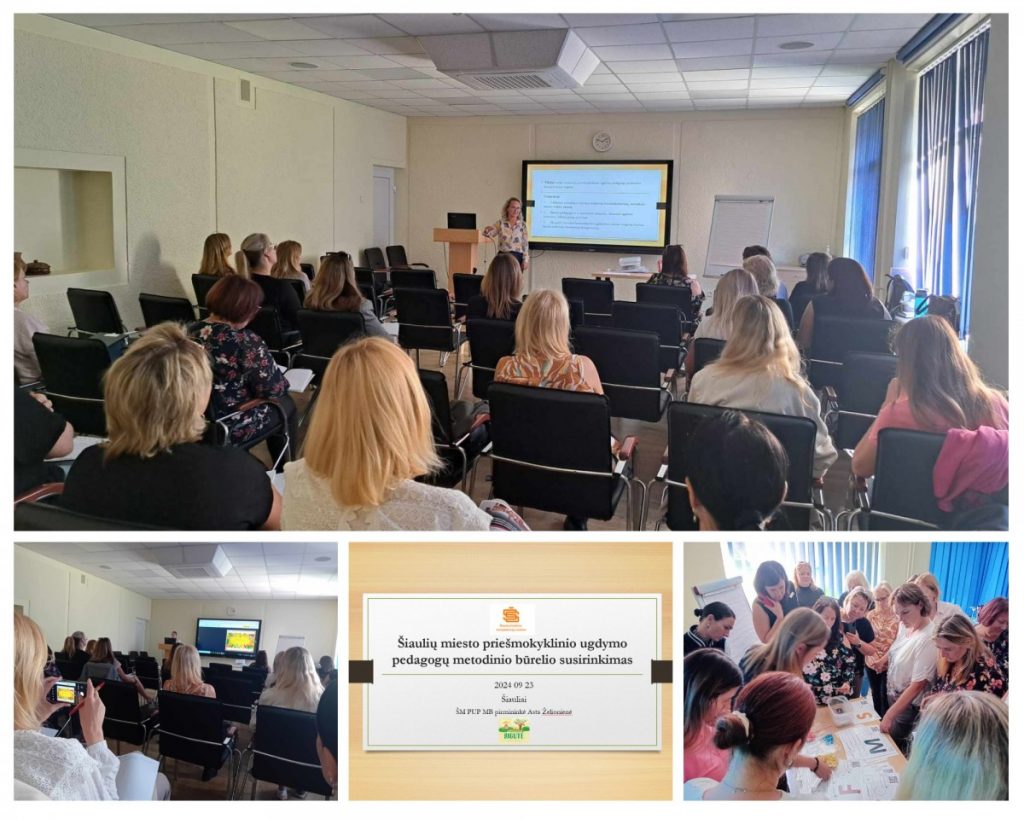 Rugsėjo 23 d. Šiaulių švietimo kompetencijų centre vyko Šiaulių miesto priešmokyklinio ugdymo pedagogų metodinio būrelio susirinkimas, kurio metu mūsų įstaigos mokytoja, ŠMPUP MB pirmininkė Asta Želionienė pasidalino praėjusių metų veiklos ataskaita, pasidžiaugė įvykusiais tradiciniais renginiais, naujais pasiūlymais bei idėjomis ir kartu su mokytojomis aptarė metodinio būrelio veiklos planą 2024–2025 m. m. Susirinkimo metu buvo pristatytos ir aprobuotos 5 metodinės priemonės. Dvi iš jų pristatė mūsų įstaigos PU mokytojos Ligita Petkuvienė ir Asta Želionienė. Mokytoja Ligita pristatė interaktyvių užduočių rinkinį „Maži herojai – dideli sveikatos atradimai” , bei kartu su mokytoja Asta pristatė interaktyvų žaidimą „Pažink knygas”, kuris buvo sukurtas projektui „Skaityk(uo)liai”. Džiugu, kad mokytojai išbando metodines naujoves, kuria ir skaitmenines priemones. Tai puiki galimybė ne tik pasidalinti gerąja patirtimi, bet ir pasisemti naujų idėjų ir motyvacijos naujiems mokslo metams.