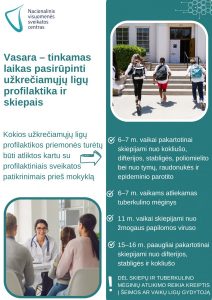 Nacionalinio visuomenės sveikatos centro (NVSC) specialistai rekomenduoja nelaukiant rudens pasirūpinti profilaktiniu vaiko sveikatos patikrinimu ir nepamiršti užkrečiamųjų ligų profilaktikos priemonių – skiepų bei mėginio dėl tuberkuliozės atlikimo.