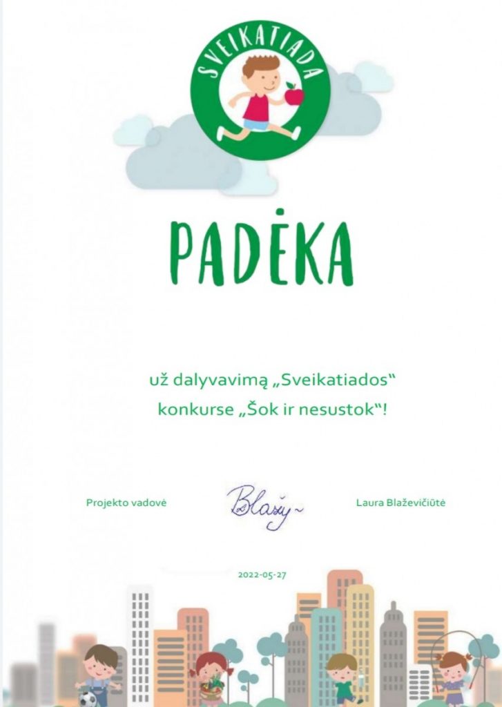 Šiaulių lopšelio-darželio „Sigutė“ priešmokyklinio ugdymo grupė „Žiogelis“ prisijungė prie Sveikatiados iššūkio „Šok ir nesustok“. Skambant nuotaikingai muzikai vaikai aktyviai šoko, patirdami daug džiugių emocijų. Smagu visiems judėti muzikos ritmu!