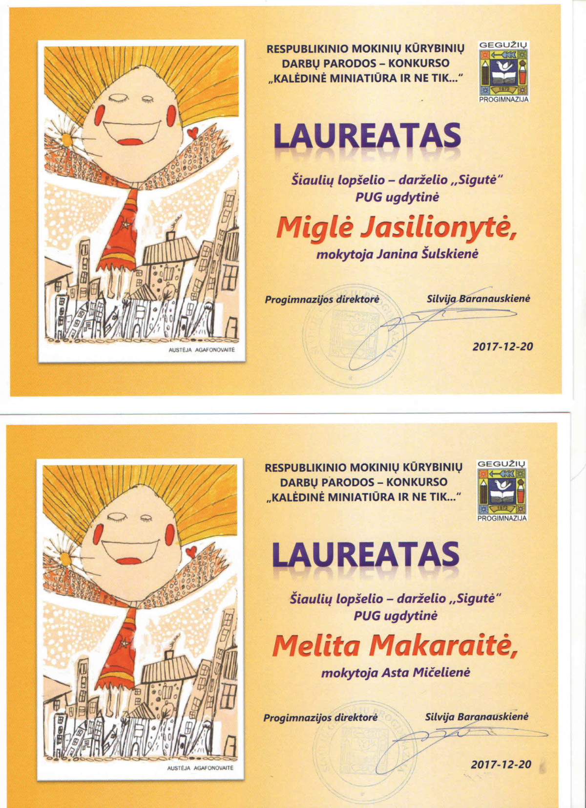 Šiaulių lopšelio-darželio ,,Sigutė” priešmokyklinio ugdymo grupės ,,Žiogelis” ugdytinės Miglė Jasilionytė (PUG pedagogė Janina Šulskienė) ir Melita Makaraitė (auklėtoja Asta Mičelienė) tapo Respublikinio mokinių kūrybinių darbų parodos-konkurso ,,Kalėdinė miniatiūra ir ne tik…” LAUREATĖMIS.