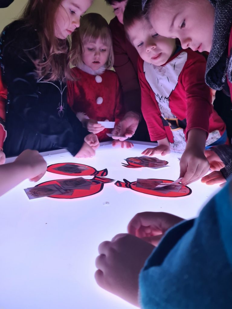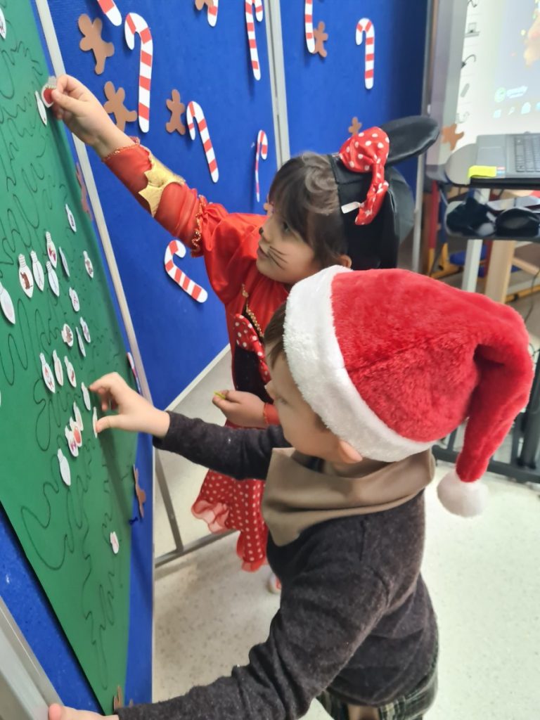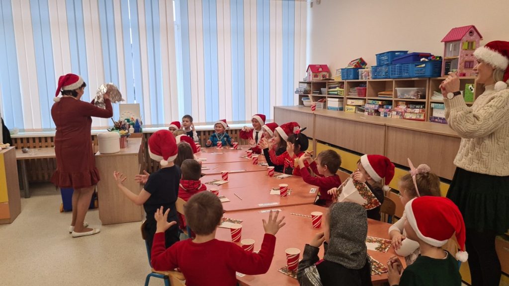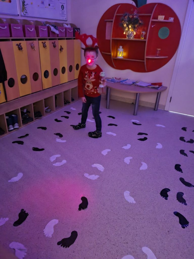 Vaikų nuo pat ankstaus ryto laukė staigmenos ir žaidimai. Logopedė K. Zelbienė vaikams parengė įdomias interaktyvias užduotėles, kurių metu vaikai padėjo nykštukams atlikti Kalėdinius darbus.