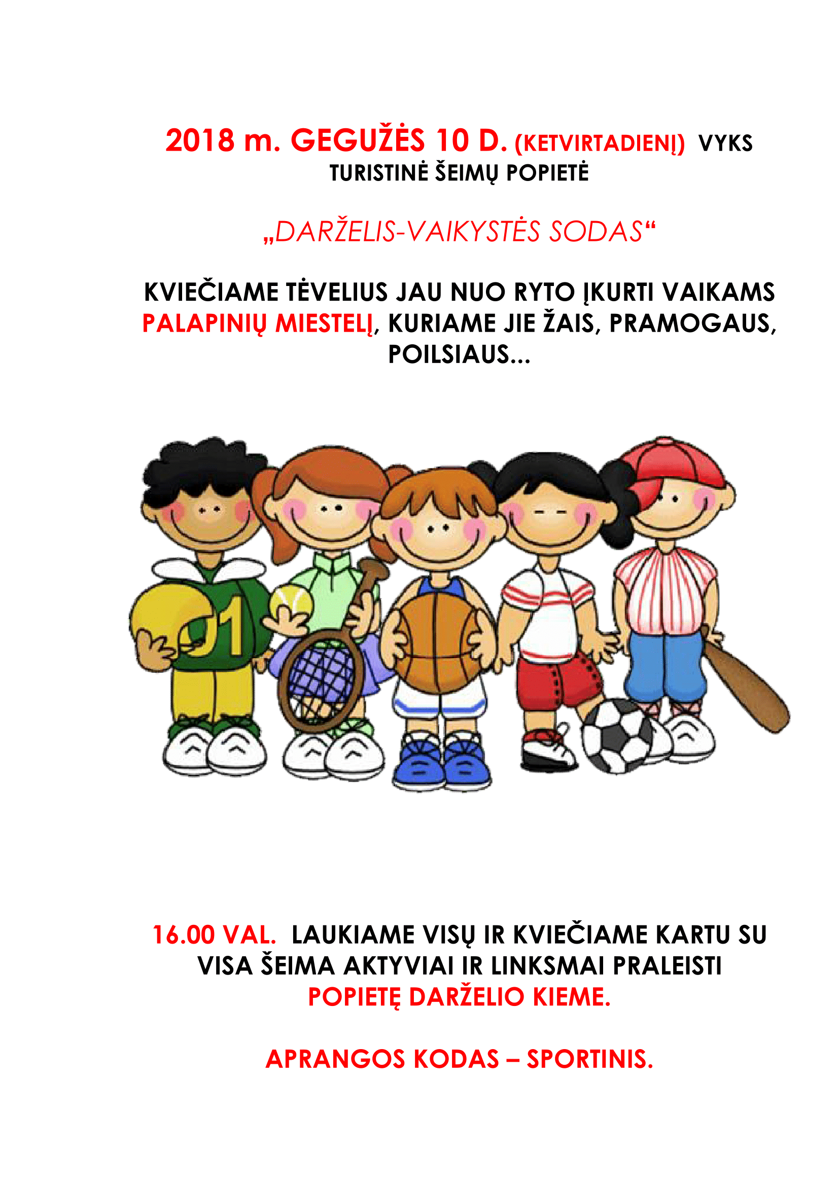 Informuojame, kad 2018 m. gegužės 10 d. vyks renginys bendruomenei „Turistinė šeimų diena“.