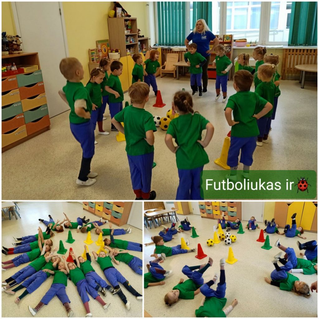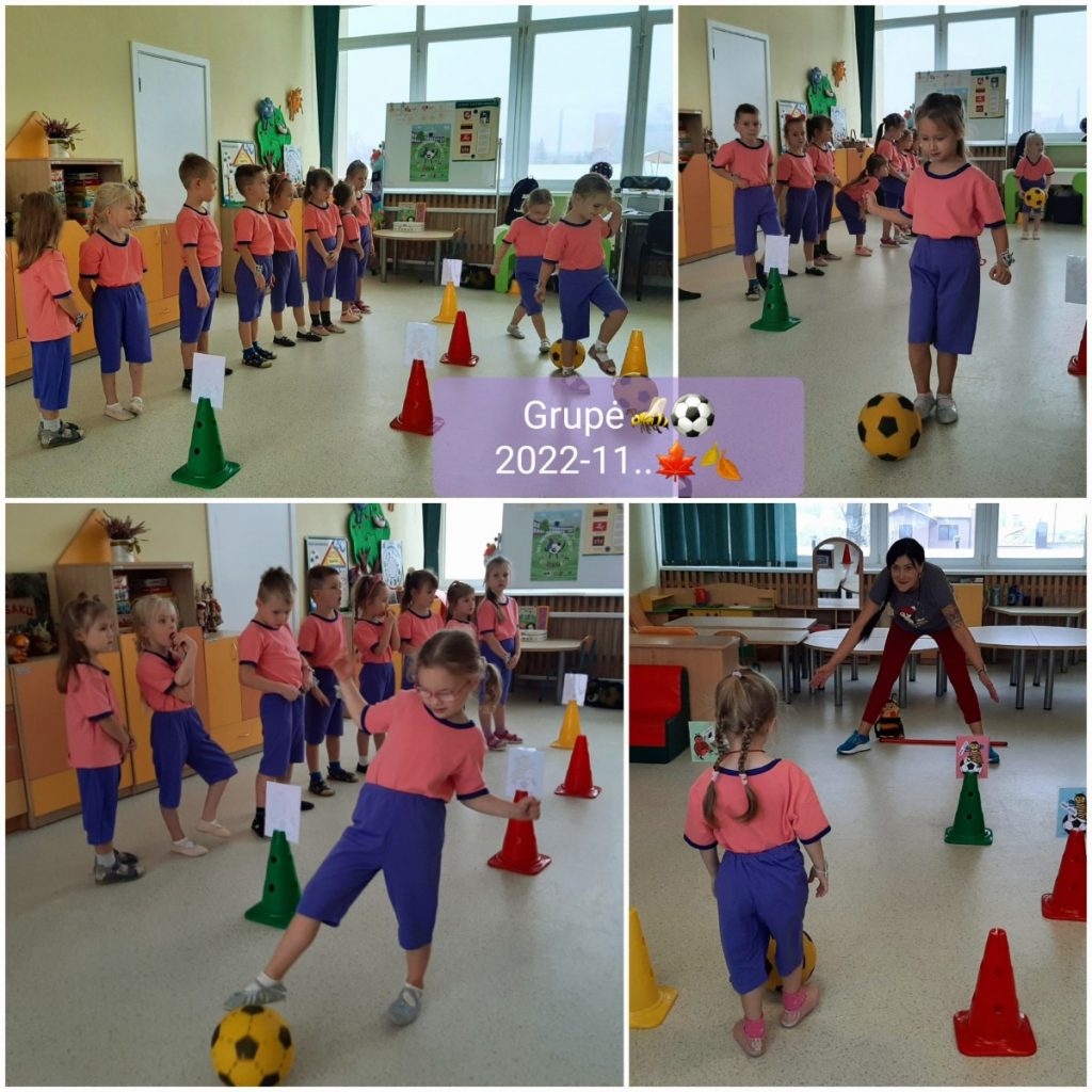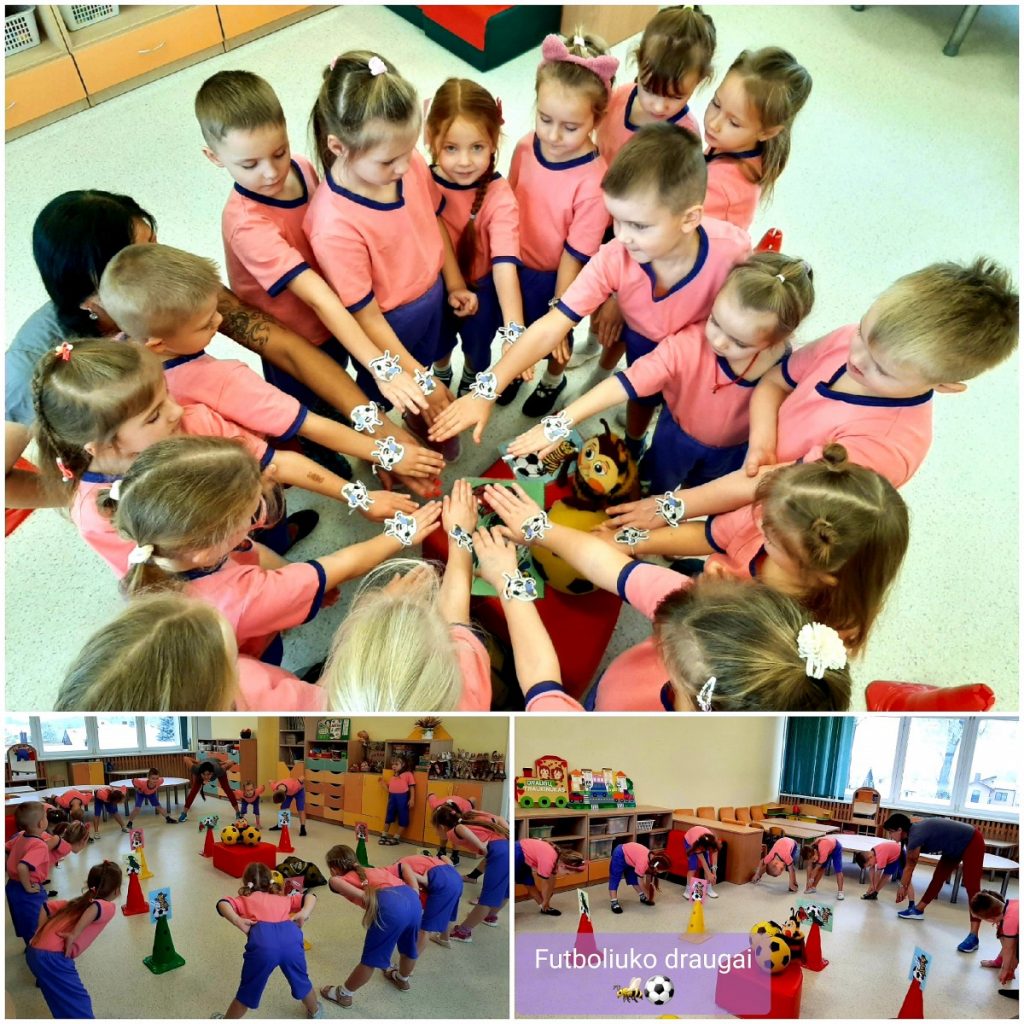 Grupių ,,Bitutė“, ,,Boružėlė“ ir ,,Žiogelis“ vaikai noriai vykdė projekto veiklas: pasveikino vieni kitus, spaudė ranką, sudėjo ,,draugų žiedą“ iš rankyčių (su futboliuko apyranke); darė apšilimą – atliko kojų ir rankų lavinimo, koordinacijos pratimus; varinėjo kamuolį erdvėje ir aplink kliūtis; mokėsi žaisti poromis, tarp visų vaikų surasti savo porą, kamuolį perduoti draugui; varė kamuolį į vartus; vartininkai stengėsi išvengti įvarčių; žaidėjai džiaugėsi įvarčiais; vaikai bandė žaisti kamuolio pramušimą tarp kojų pedagogui, jo apvarymą.