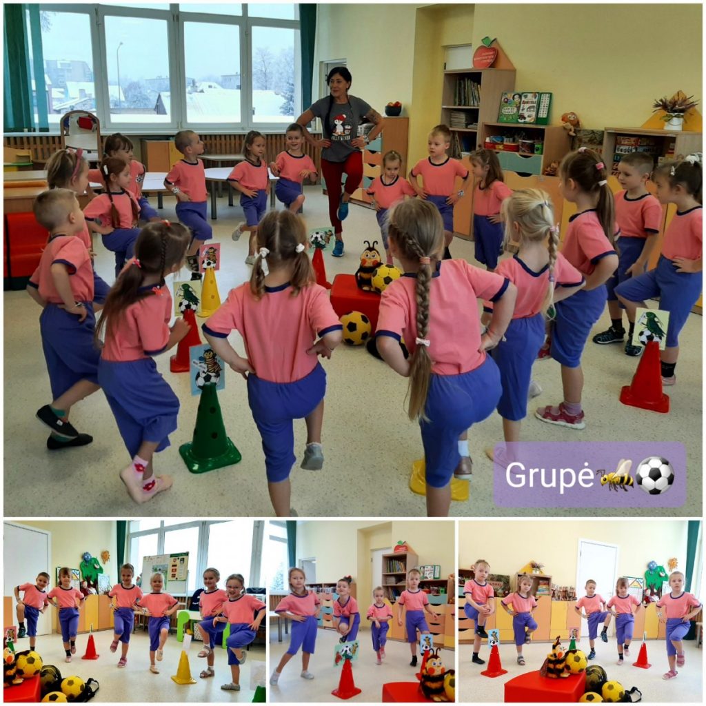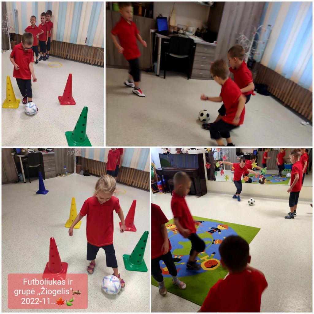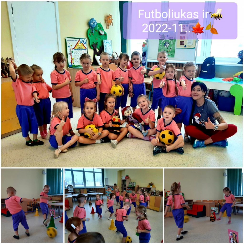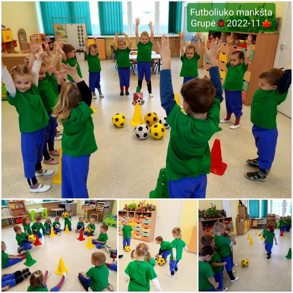 Grupių ,,Bitutė“, ,,Boružėlė“ ir ,,Žiogelis“ vaikai noriai vykdė projekto veiklas: pasveikino vieni kitus, spaudė ranką, sudėjo ,,draugų žiedą“ iš rankyčių (su futboliuko apyranke); darė apšilimą – atliko kojų ir rankų lavinimo, koordinacijos pratimus; varinėjo kamuolį erdvėje ir aplink kliūtis; mokėsi žaisti poromis, tarp visų vaikų surasti savo porą, kamuolį perduoti draugui; varė kamuolį į vartus; vartininkai stengėsi išvengti įvarčių; žaidėjai džiaugėsi įvarčiais; vaikai bandė žaisti kamuolio pramušimą tarp kojų pedagogui, jo apvarymą.